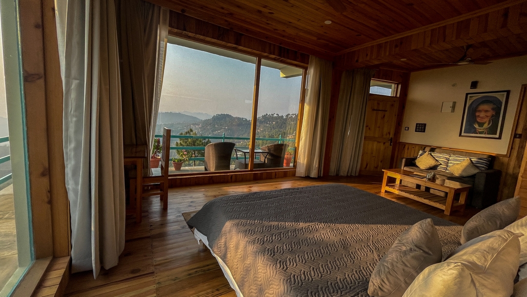 Our Trishul family room is situated above the cafe and provides two spacious bedrooms as well as a private rooftop sit-out. The rooftop sit-out is the perfect space to breathe in the fresh mountain air and enjoy the serene surroundings. Whether you're traveling with your family or a small group of friends, our Trishul family room offers the perfect space to unwind and soak up the natural beauty of Kumaon.